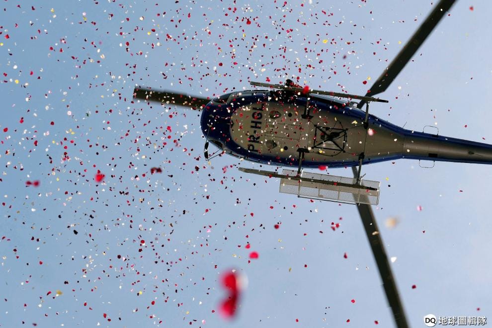 直昇機在城鎮布魯馬迪紐(Brumadinho)的高空下灑下花瓣,悼念在尾礦壩潰堤後消逝的 180條人命。