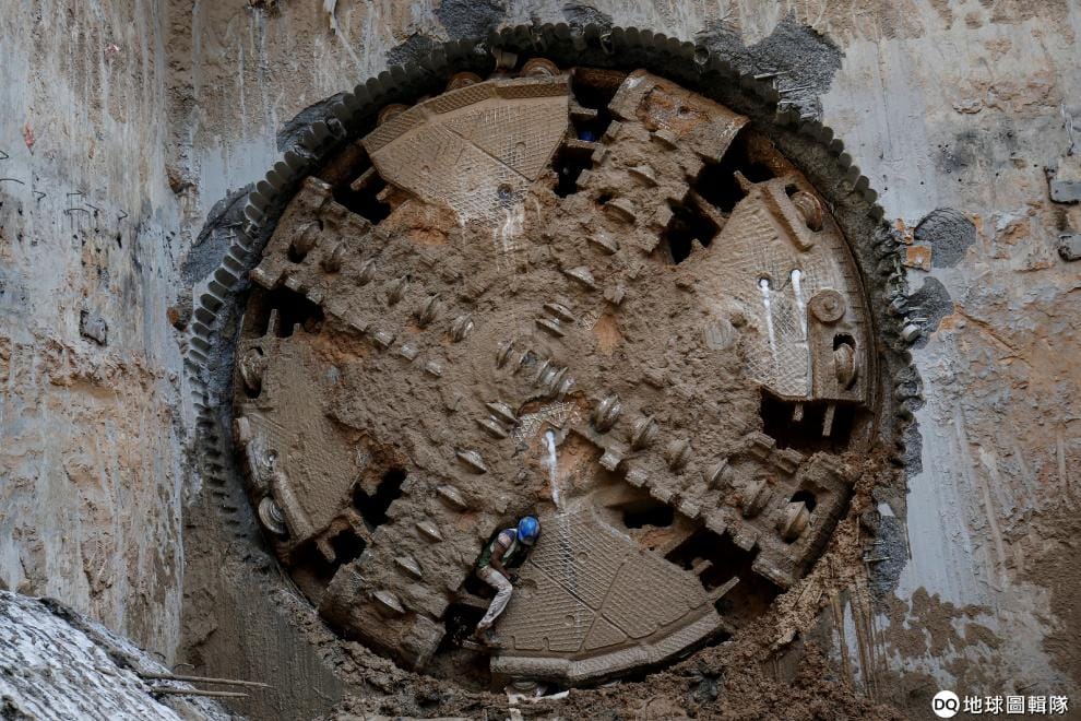 在艾哈邁達巴德(Ahmedabad),一名工人跨過了專門用來開鑿隧道的全斷面隧道鑽掘機(Tunnel Boring Machine, TBM),這裡正在為開挖地鐵鐵路忙碌著。