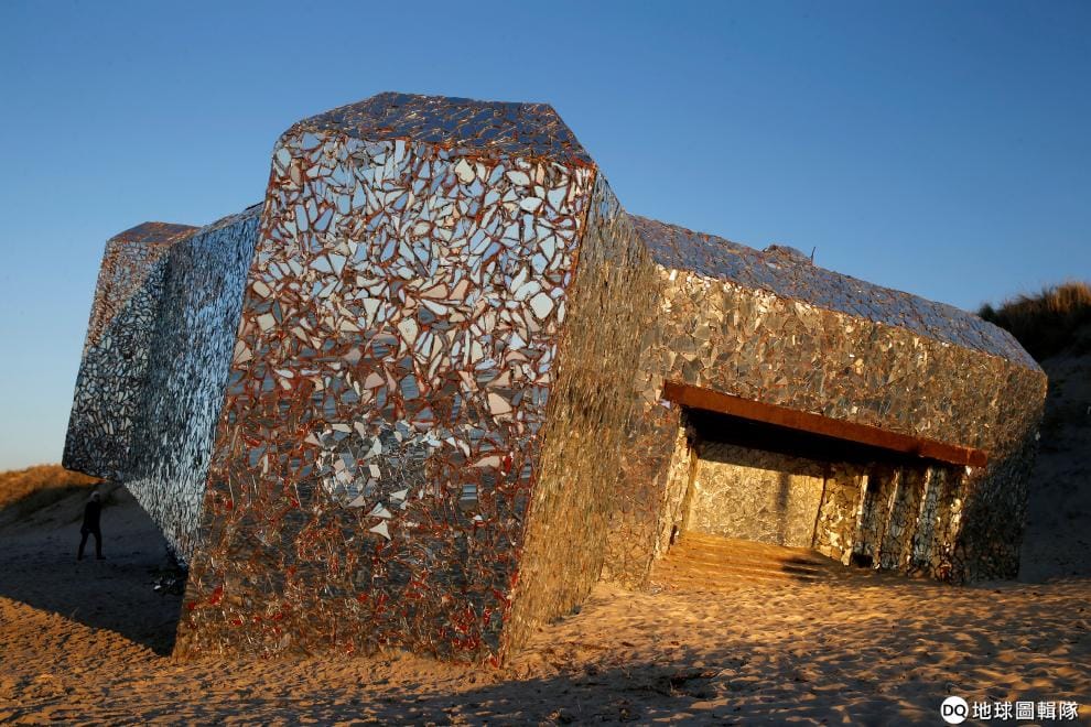 曾經的地下碉堡被不知名藝術家貼上了滿滿的碎玻璃,在太陽光線下顯得熠熠生輝。這裡是北部市鎮萊夫蘭克烏克(Leffrinckoucke)的沙灘。