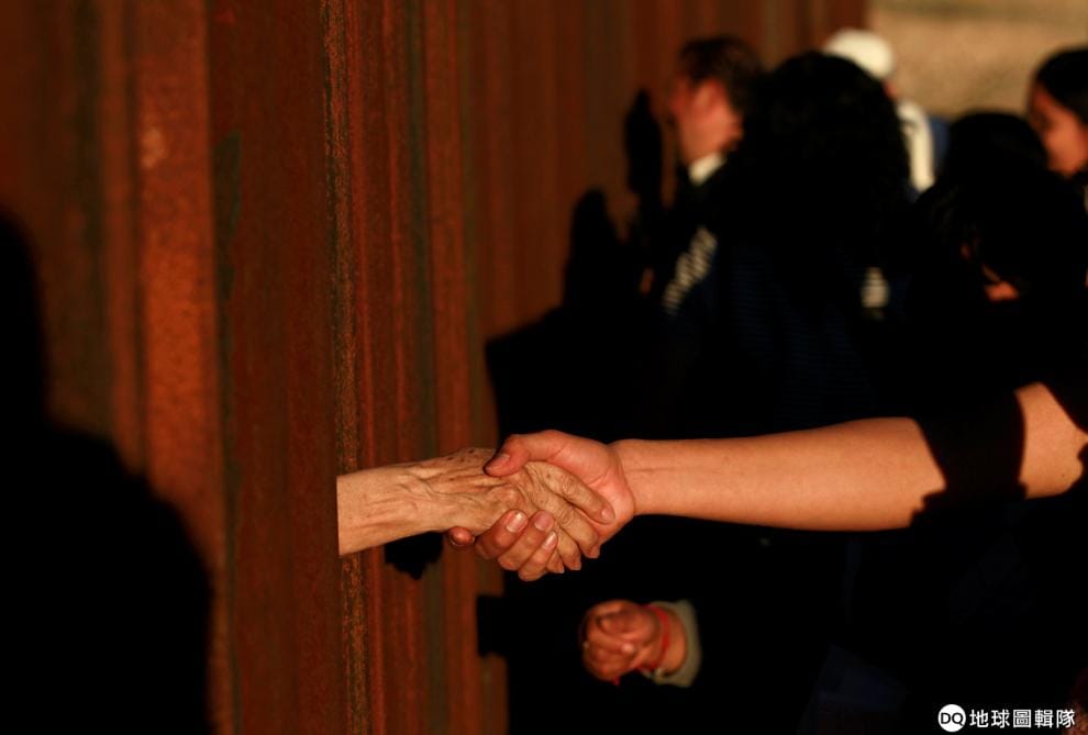 在美墨邊境,人們透過圍籬間的空隙,和另一個國家的人們握手打招呼。這裡正在舉辦跨宗教交流,以此對美國總統川普的邊境政策表達不滿。