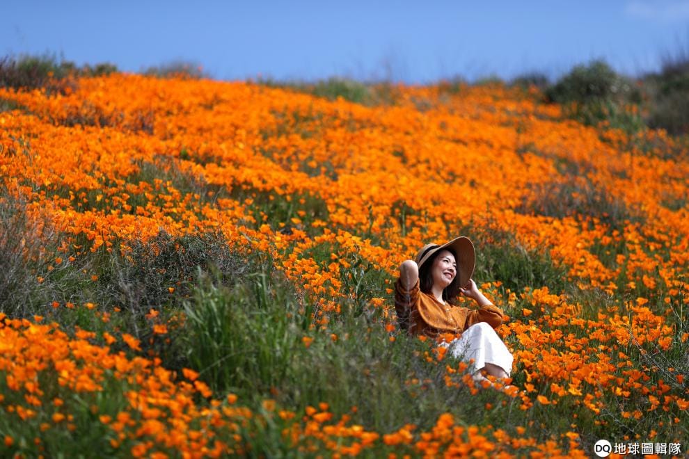 一名女子坐在盛開的罌粟花之間,橘澄澄的景致讓畫面顯得好不壯觀。