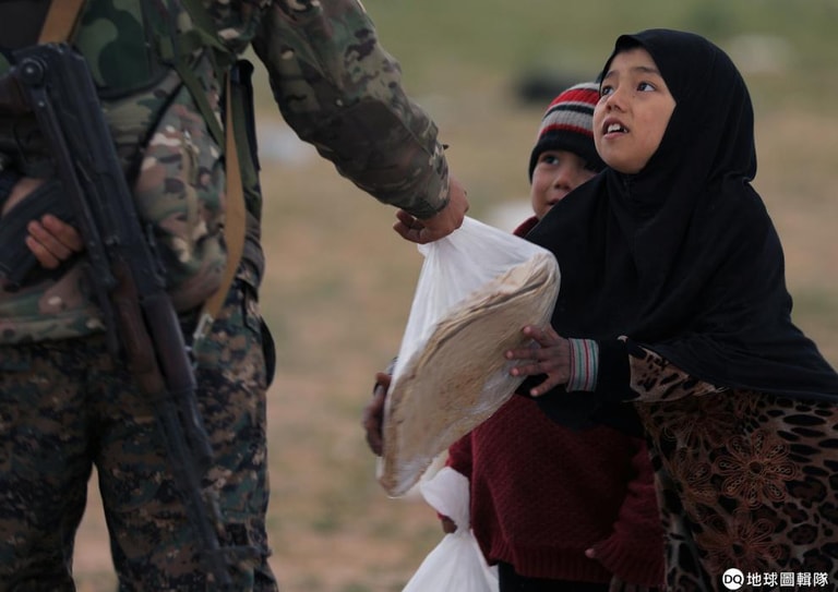 在敘利亞東部的巴古斯村(Baghouz)附近,敘利亞民主力量(Syrian Democratic Forces, SDF)正在發送物資給平民。