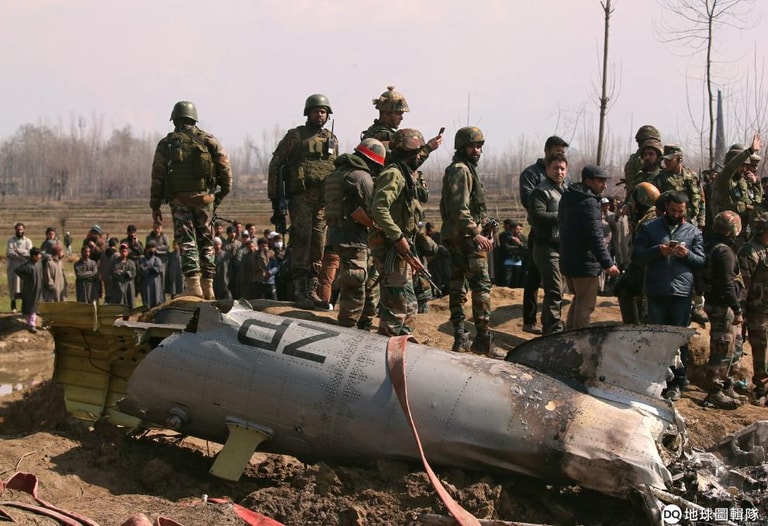在喀什米爾地區,印度軍人正在調查遭到擊落的戰機殘骸。