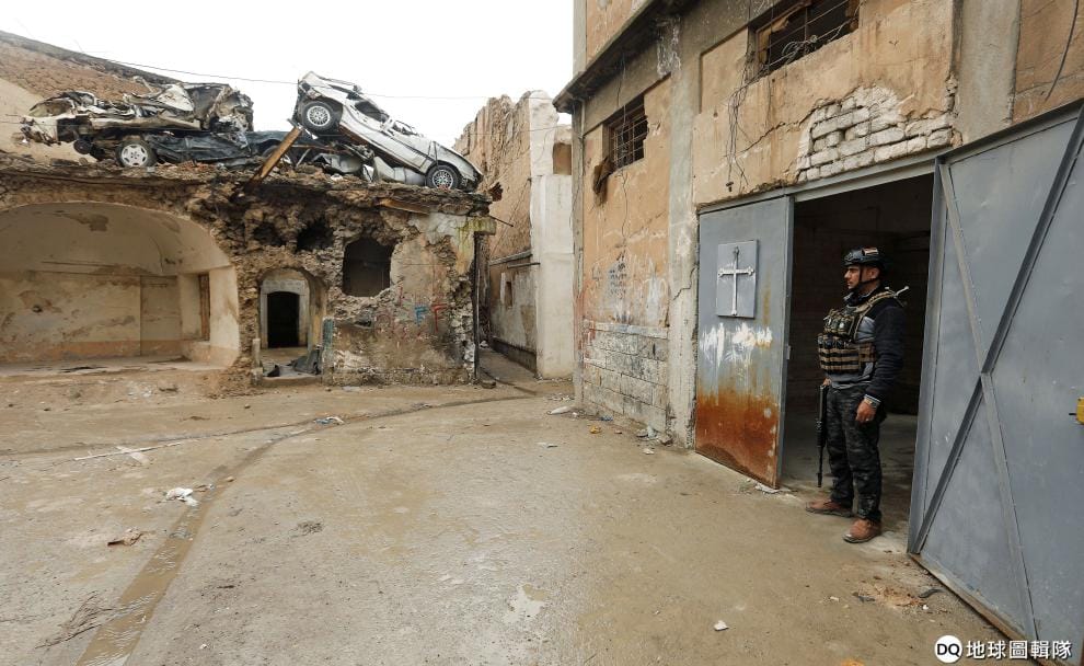 在摩蘇爾城(Mosul),一名伊拉克維安部隊的成員站在聖湯瑪斯敘利亞禮天主教會(St. Thomas of Syriac Catholic church)的入口處,協助當地維持秩序。