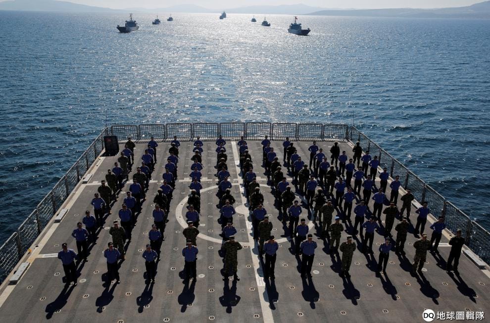 在TCG Bayraktar(L-402)號戰車登陸艦上,剛進行完登陸演習的軍事成員就定位。土耳其這陣子在進行代號「藍色祖國 2019」(Blue Homeland 2019)軍演,是他們歷年來最大的海軍演習。