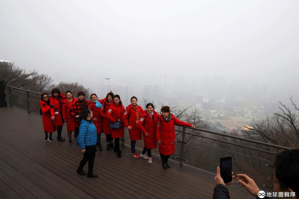 來自中國的觀光客站在一起合照,不過受到空汙影響,與他們合影的只是一片霧濛濛的景致。