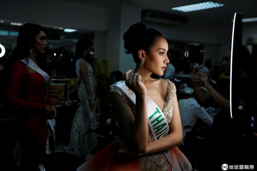 來自泰國的選美參賽者正在後台準備著。這裡正在進行跨性別選美活動「2019國際皇后小姐」(Miss International Queen 2019),畫面中已經來到決賽環節。