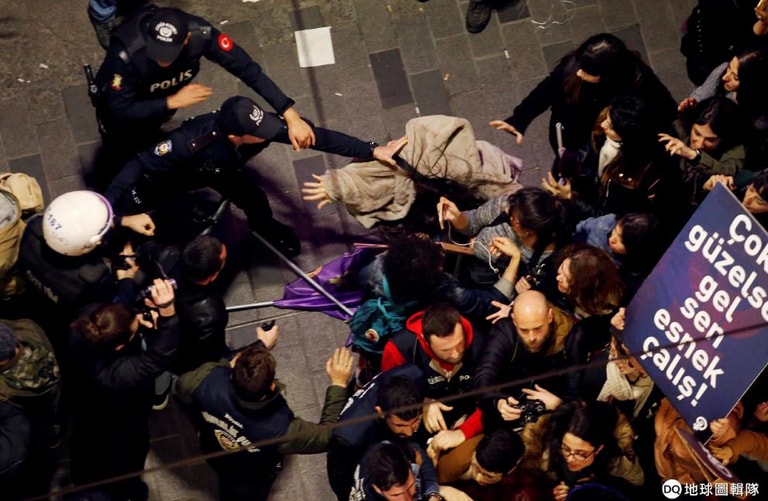 在城市伊斯坦堡(Istanbul)街頭,警察正在驅離響應國際婦女節而上街遊行的民眾。
