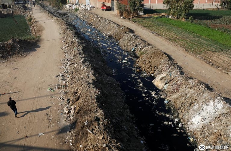 在開羅街頭,一名男子走過了本該是灌溉水道的地方,這裡現在卻積滿了各式各樣的垃圾。