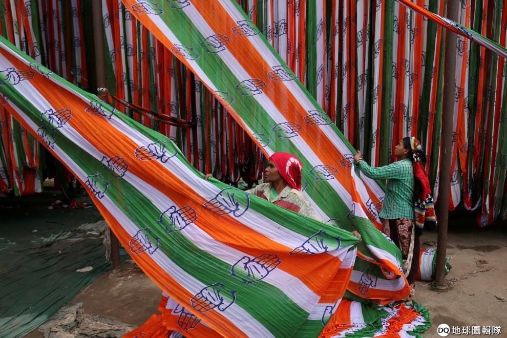 在一家旗幟製作場裡,工人們正忙著製作印度最大反對黨國民大會黨(Congress party)的黨旗。印度即將在 2019年5月舉辦大選。