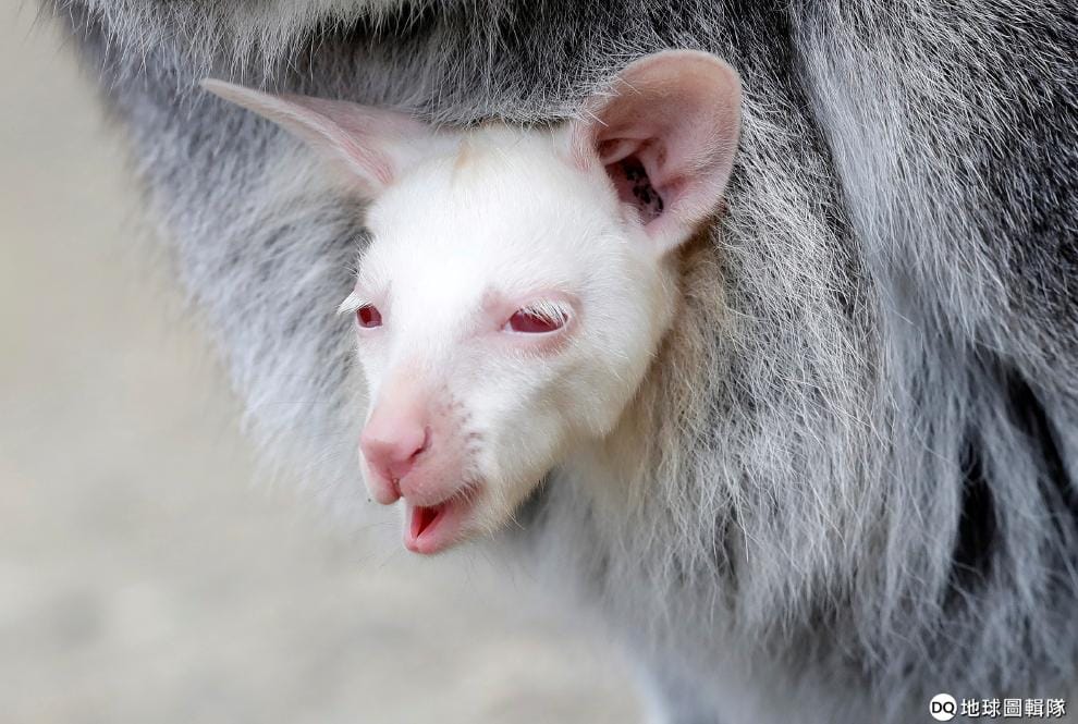 在城市傑欽(Decin)的動物園裡,一隻剛出生的紅頸小袋鼠白子在媽媽的育兒袋中接受照護。