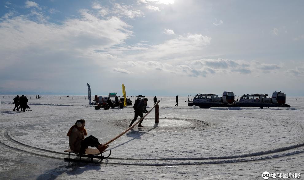 在小鎮利斯特維揚卡(Listvyanka),人們正開心地在結凍的貝加爾湖畔上玩耍。