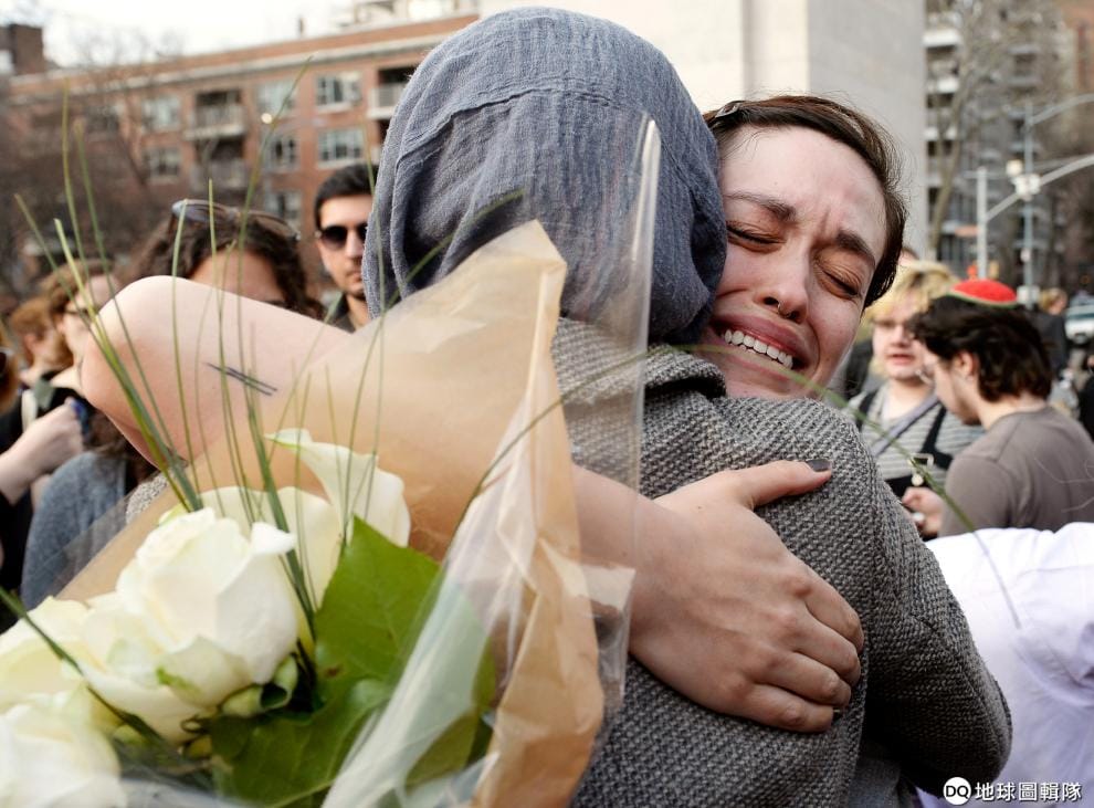 畫面中為華盛頓廣場公園前,人們一同替在基督城清真寺恐攻事件的罹難者哀悼。