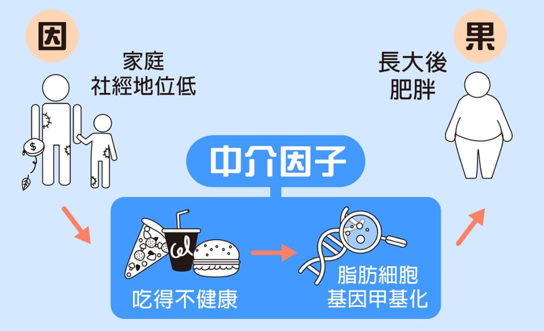 肥胖的原因有很多,其中一個是:在美國已經知道「小時候家裡社經地位低」和「長大後過胖」這兩者的關係是確立的,但不知道中間的機制。我們用因果中介模型分析發現,其實這中間可能是受到基因甲基化的影響。