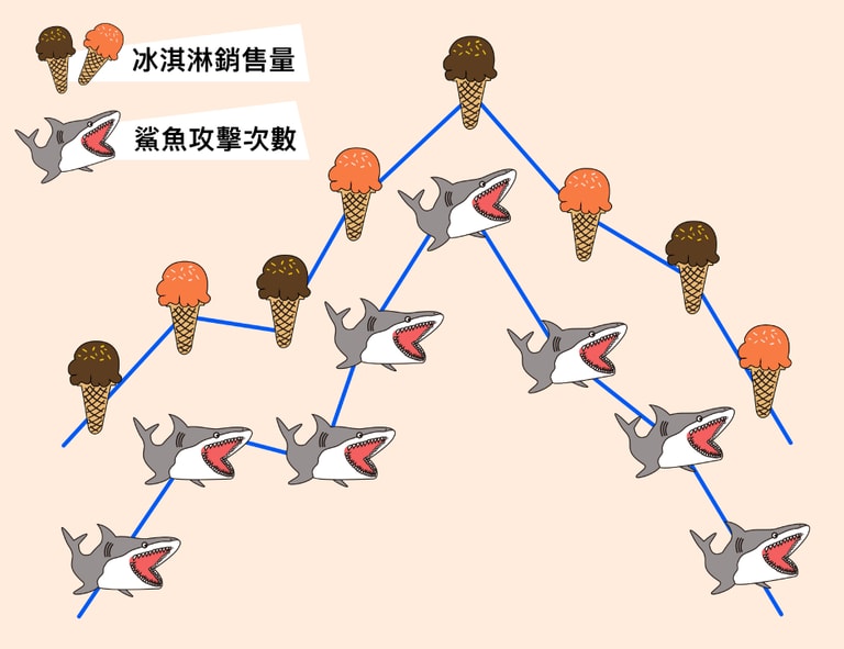 可能有人看了這個資料,會下一個結論:吃冰淇淋會導致你容易被鯊魚攻擊。但真的是這樣嗎?其實影響這兩者的原因是「夏天」。因為夏天人們喜歡吃冰淇淋,而夏天人們也喜歡去海邊,導致被鯊魚攻擊的次數提高。