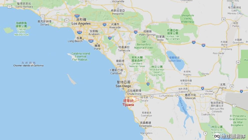 圖中紅色區域就是墨西哥提華納城,許多來自中美洲的移民試圖從這裡翻越美墨圍牆,非法入境美國。