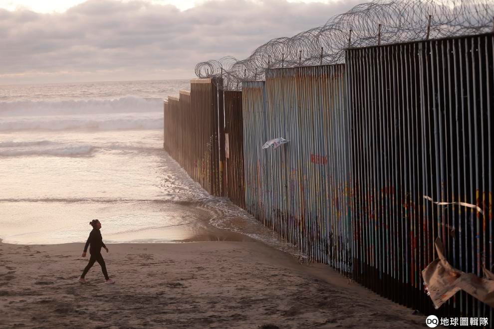 2019年1月,在墨西哥提華納城,一名女子朝著上頭設有鐵絲網的美墨圍欄筆直地走過去。