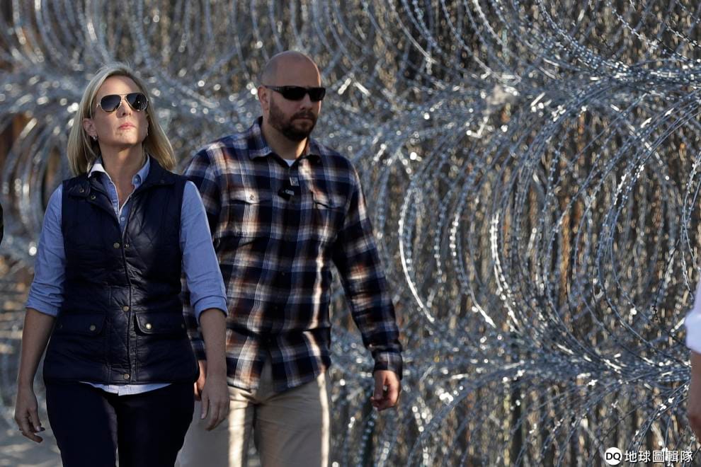 2018年11月,美國國土安全部長尼爾森(Kirstjen Nielsen,左)來到將美國與提華納城隔離的鐵絲網邊界視察。美方在這裡設置的鐵絲網不僅更耐用,殺傷力也比一般鐵絲網強。