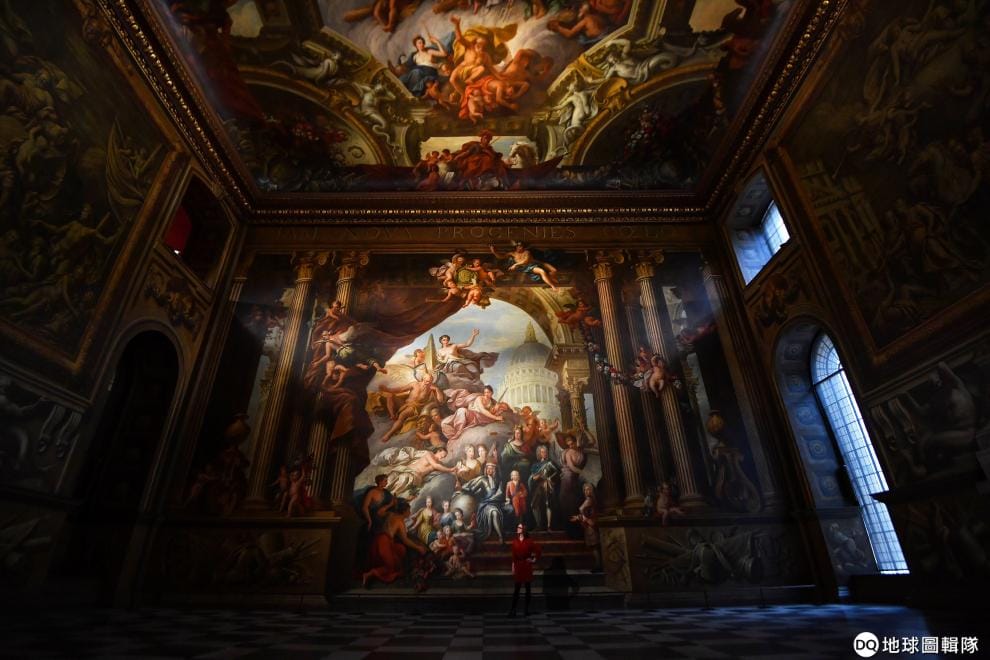 在英國皇家海軍學院(Royal Naval College)裡,一名藝廊助理站在彩繪廳(Painted Hall)欣賞著眼前的壁畫。這裡在修復完成後,將在本月 23號重新對外開放。