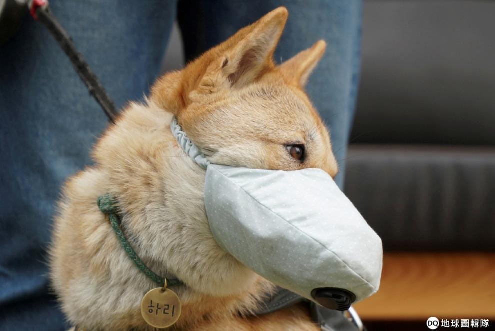 一歲半的珍島犬「海利」(Hari)戴起狗狗專用口罩。南韓在這一陣子遭逢嚴重霧霾,也讓南韓當局採取汽車單雙號管制等降低空汙等辦法。