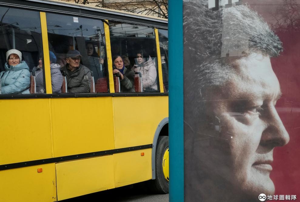 人們搭著公車經過了現任烏克蘭總統波洛申科(Petro Poroshenko)的競選海報。烏克蘭即將在今年 3月31日舉辦總統大選,屆時一共有 44名候選人參與競選。