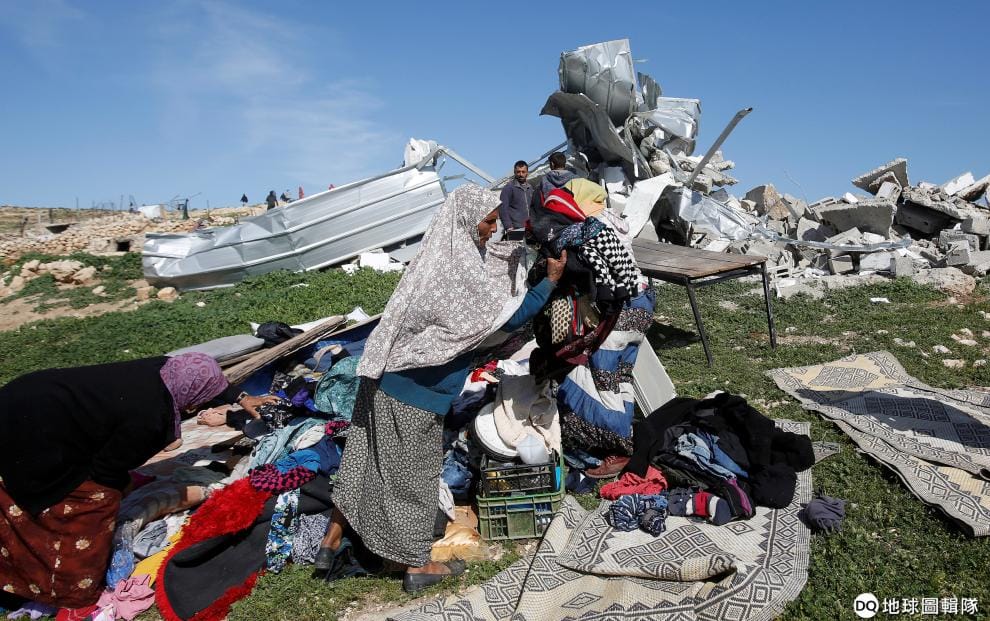 一群巴勒斯坦人正在整理自己的家當。他們的住處因為被以色列當局判定沒有取得建築執照,而遭到以色列武力部隊拆除。
