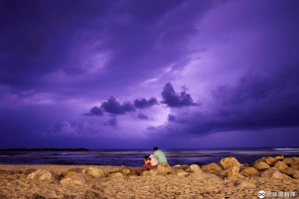 在地中海城市亞實基倫(Ashkelon),民眾看著閃電劃破紫色的天空。