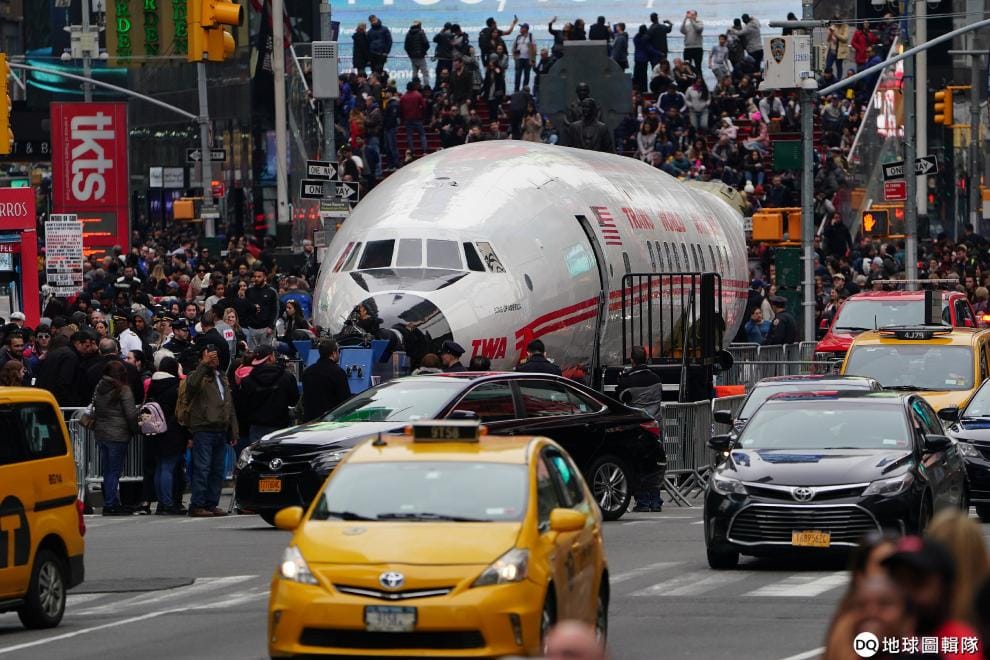 在紐約街頭,人們搶拍身長 35公尺的飛機,這架退役飛機準備被運到紐約甘迺迪機場的環球航空飯店,並且改造成飯店裡頭的酒吧。