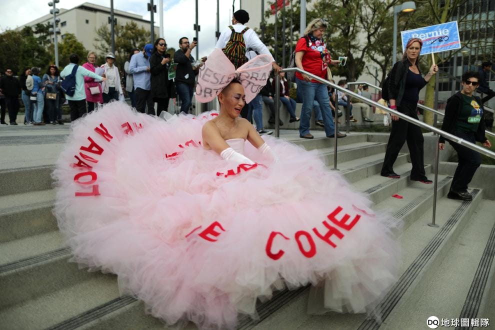 在加州洛杉磯街頭,支持民主黨參議員桑德斯(Bernie Sanders)競選 2020年美國總統大選的民眾,穿上裝飾著川普前律師「寇恩」(Michael Cohen)和川普前競選主任「馬納福特」(Paul Manafort)名字的粉紅禮服,在街頭替桑德斯拉票。身為川普的親信,據傳寇恩和馬納福特掌握了川普通俄的證據,然而這一切並沒有在最新出爐的《穆勒報告》中獲得證實。