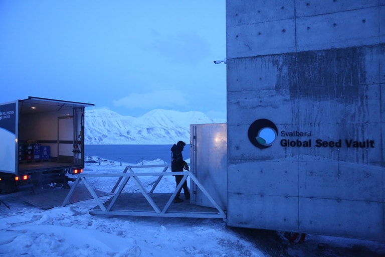 2008年落成的「末日種子庫」位在北極圈內挪威斯瓦爾巴群島(Svalbard)上,島上號稱全球最北的小鎮──朗伊爾鎮(Longyearbyen)住著為數不多的挪威居民。近幾年,隨著全球暖化加劇,不但種子庫在去年面臨融水滲入的問題,居住在這座諾亞方舟附近小鎮的居民也面臨了環境異變。