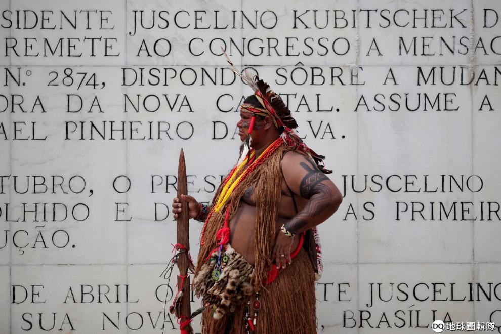 在首都巴西利亞的政府部門外,一名來自Pataxo部落的原民前來抗議,他代表部落表達對巴西總統波梭奈羅(Jair Bolsonaro)的不滿,因為總統打算將原民的醫療保健服務從聯邦手中轉到地方政府。