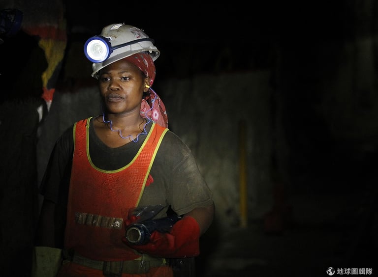 一名女性礦工站在南非魯斯登堡(Rustenburg)的礦坑,礦場裡一片漆黑。