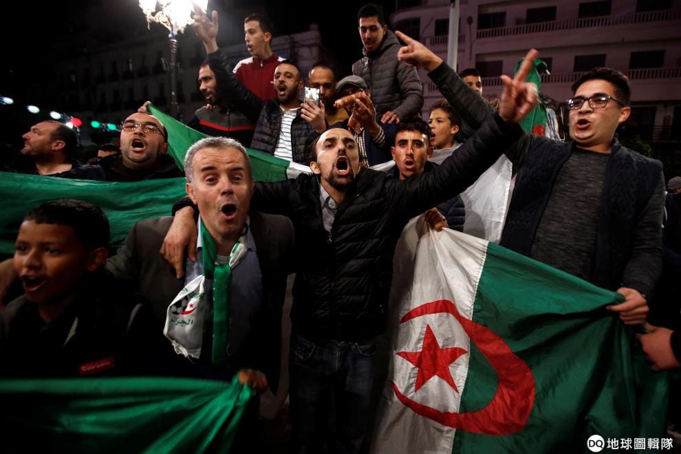 在首都阿爾及爾(Algiers),人們拿著阿爾及利亞國旗上街慶祝總統包特夫里卡(Abdelaziz Bouteflika)宣布辭職。