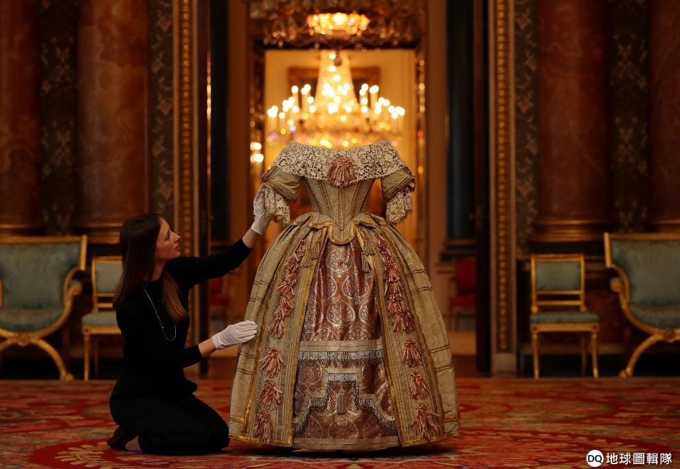 在倫敦白金漢宮(Buckingham Palace),一名工作人員正在整理維多利亞女王(Queen Victoria)的禮服。1851年6月13日,維多利亞女王就是穿著這一襲禮服參加斯圖亞特舞會(Stuart ball)。這件禮服也即將於今年 7月20日白金漢宮向大眾開放時展出。