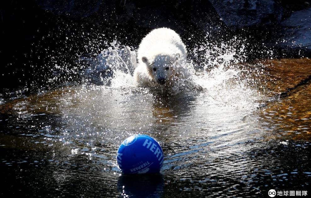 在柏林動物園內,剛剛獲得新名字的小北極熊赫塔(Hertha)開心地玩著印有牠名字的海灘球。
