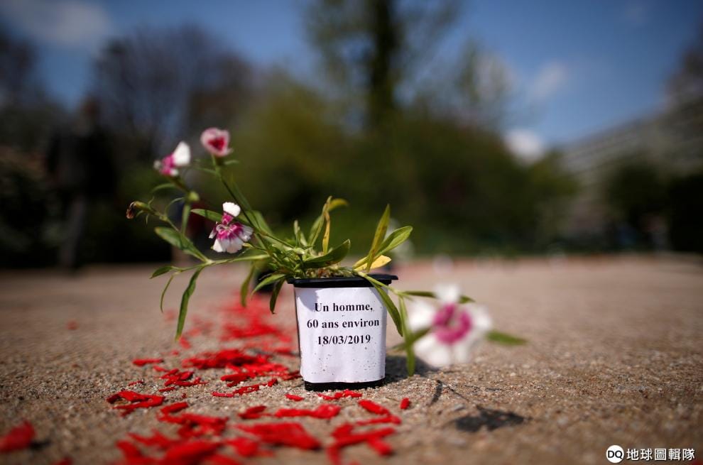 在巴黎街頭,民眾擺上鮮花悼念今年 3月18日在大街上被發現死亡的街友。根據統計,法國去年有 566名無家可歸之人死在大街上。