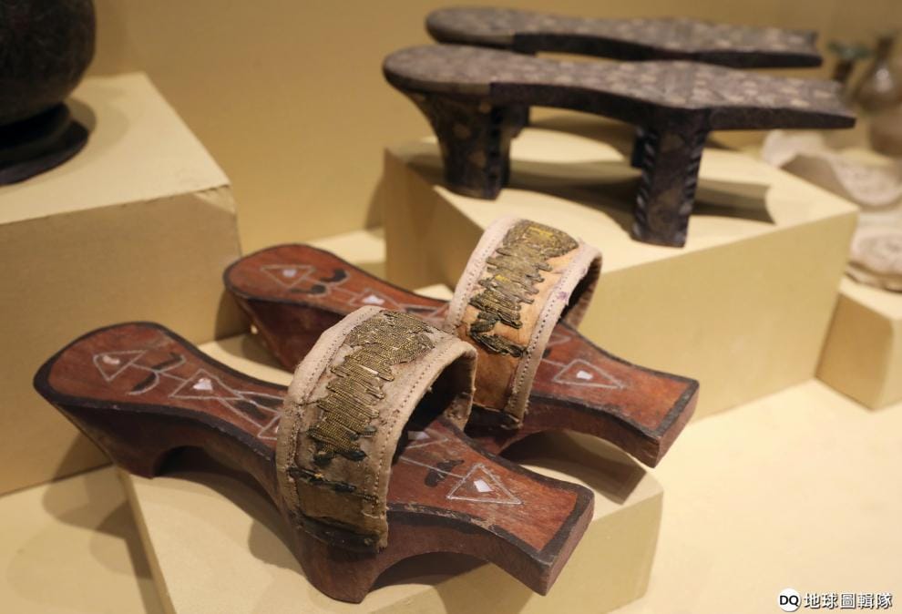 在埃及南部城市索哈傑(Sohag)的國立博物館,館方展示出一雙法老穿過的鞋子,還有許多古埃及文物與雕像。