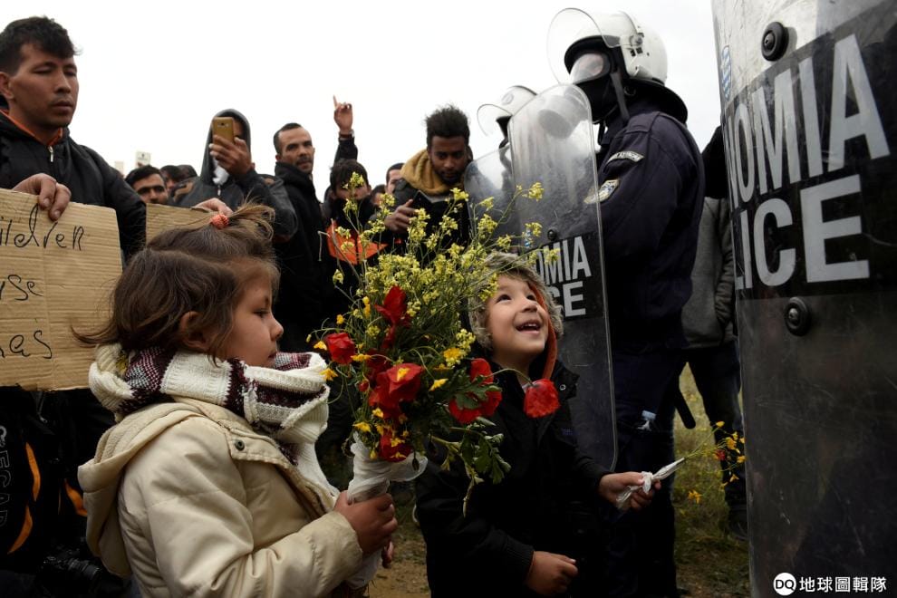 在北部的季亞瓦塔(Diavata)村,移民孩童拿著鮮花獻給鎮暴警察。