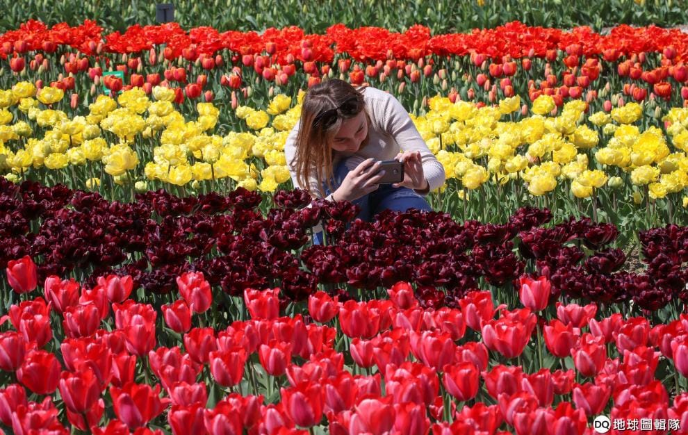 在有歐洲最老植物園之稱的克里米亞Nikitsky植物園,一名女子拿著手機拍下五顏六色的鬱金香。