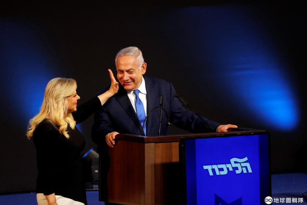 在特拉維夫的以色列聯合黨(Likud)黨部,黨魁兼以色列總理納坦雅虎(Benjamin Netanyahu)的妻子莎拉(Sara Netanyahu)輕拍他的臉頰,他們正在等待國會大選的結果。根據最新開票結果,以色列總理納坦雅虎帶領的聯合黨雖然與對手前國防軍參謀總長甘茨(Benny Gantz)代表的藍白聯盟(Blue and White coalition)同樣在國會拿下 35席,但納坦雅虎會與其他政黨合組聯合政府,他也將繼續擔任總理,而甘茨也已經承認敗選。