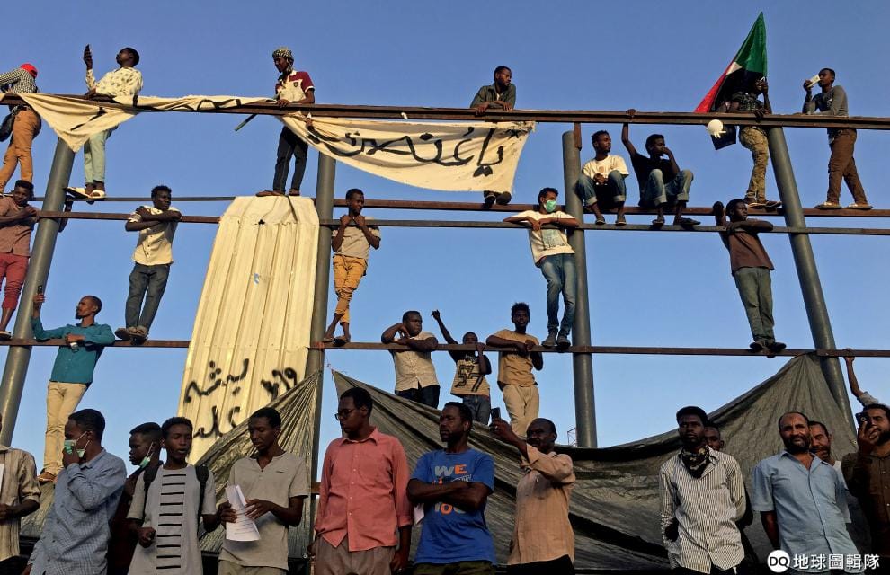 在位於首都喀土木(Khartoum)的蘇丹國防部附近,抗議民眾站在原本架著看板的欄杆上,要求總統巴席爾(Omar Al-Bashir)下台。巴席爾從 1989年開始統治蘇丹,這幾個月來不斷遭到民眾示威抗議。原本民眾上街是為了抗議物價不斷飆高,但隨著對經濟民生的不滿演變成對執政者的憤怒,現在他們改要巴席爾下台負責。