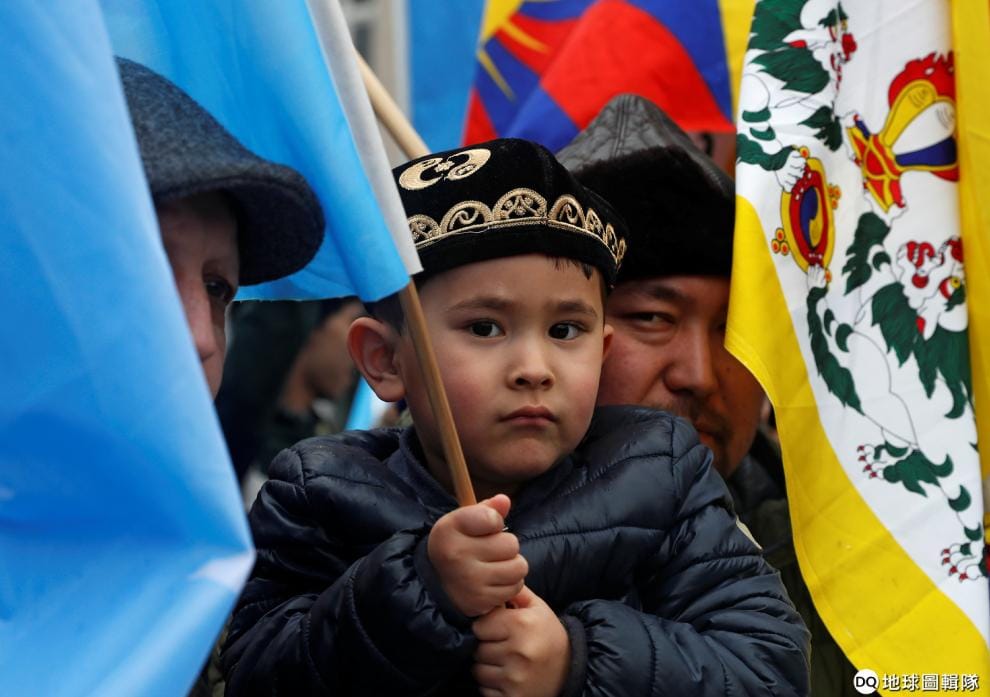 在布魯塞爾歐盟總部外,民眾舉著象徵新疆獨立的「東突厥斯坦伊斯蘭共和國」旗幟和象徵西藏獨立的雪山獅子旗抗議歐盟─中國高峰會,呼籲歐盟不要與迫害人權的中國政府合作。