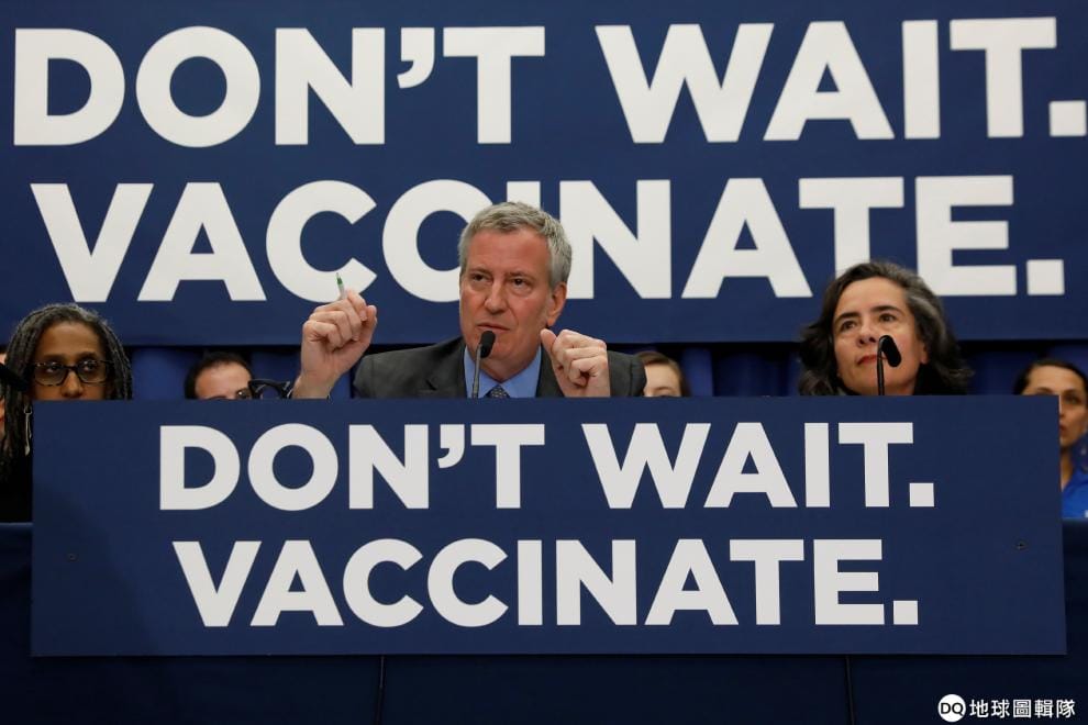 9號這天,紐約市長白思豪(Bill de Blasio)在記者會上宣布布魯克林區已經成為麻疹重災區,他也呼籲還沒打麻疹疫苗的民眾趕快去打,否則當局就會開罰。