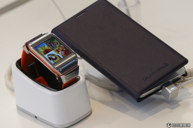照片中與智慧手錶放在一起的是同樣在當天發表的Galaxy Note3,搭載5.7英寸的大銀幕,卻比前一代Note2更輕,支援4K 影片拍攝等等功能讓Note 3更吸睛