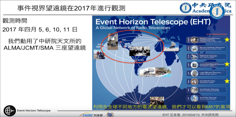 註:參與觀測此次黑洞事件視界的 8 座電波望遠鏡為:阿塔卡瑪大型毫米及次毫米波陣列望遠鏡(ALMA)、阿塔卡瑪探路者實驗(APEX)、IRAM 30 米望遠鏡(IRAM)、詹姆士克拉克麥克斯威爾望遠鏡(JCMT)、大型毫米波望遠鏡(LMT)、次毫米波陣列望遠鏡(SMA)、南極望遠鏡(SPT)。