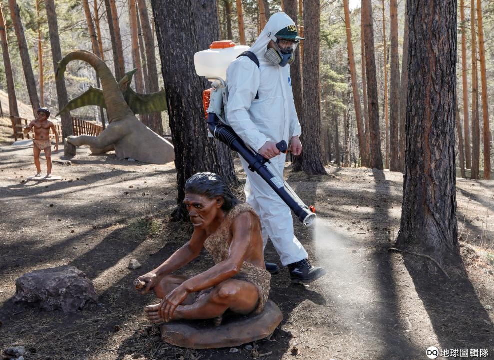 在羅伊孚露奇動物園(Royev Ruchey zoo),消毒人員經過恐龍和原始人的雕塑,沿路噴灑防蜱蟲的藥劑。