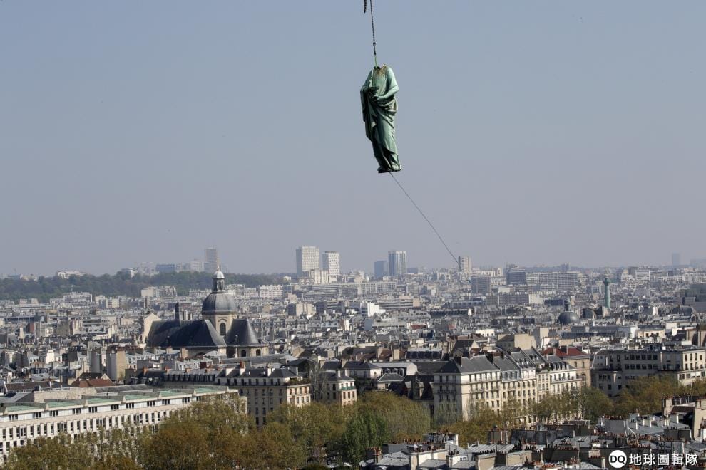 11號這天,為了修復巴黎聖母院的尖塔,工作人員先將塔上的聖人像用吊臂取下,結果就出現了這幅引人注目的畫面。