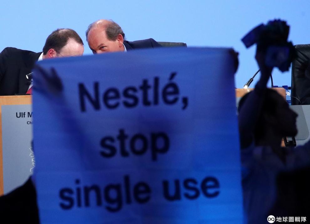 在洛桑(Lausanne)舉辦的雀巢(Nestle)第 152屆年會上,綠色和平組織的成員拉起布條抗議,要雀巢不要再使用一次性塑膠汙染環境。
