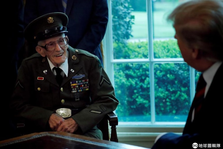 在白宮橢圓形辦公室內,今年 101歲的二戰退伍軍人威格菲爾德(Floyd Wigfield)正在和美國總統川普(Donald Trump)聊天。