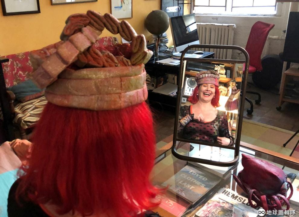 在紐約市,本身也是一名藝術家的迪特里希(Martina Dietrich)正在試戴 1960年代藝術家拉波波特(Debra Rapoport)用紙巾做成的帽子。